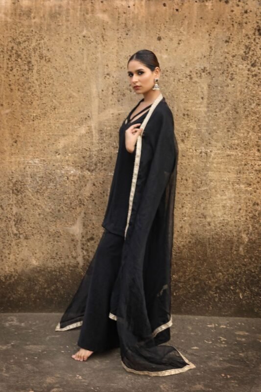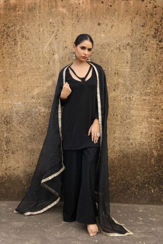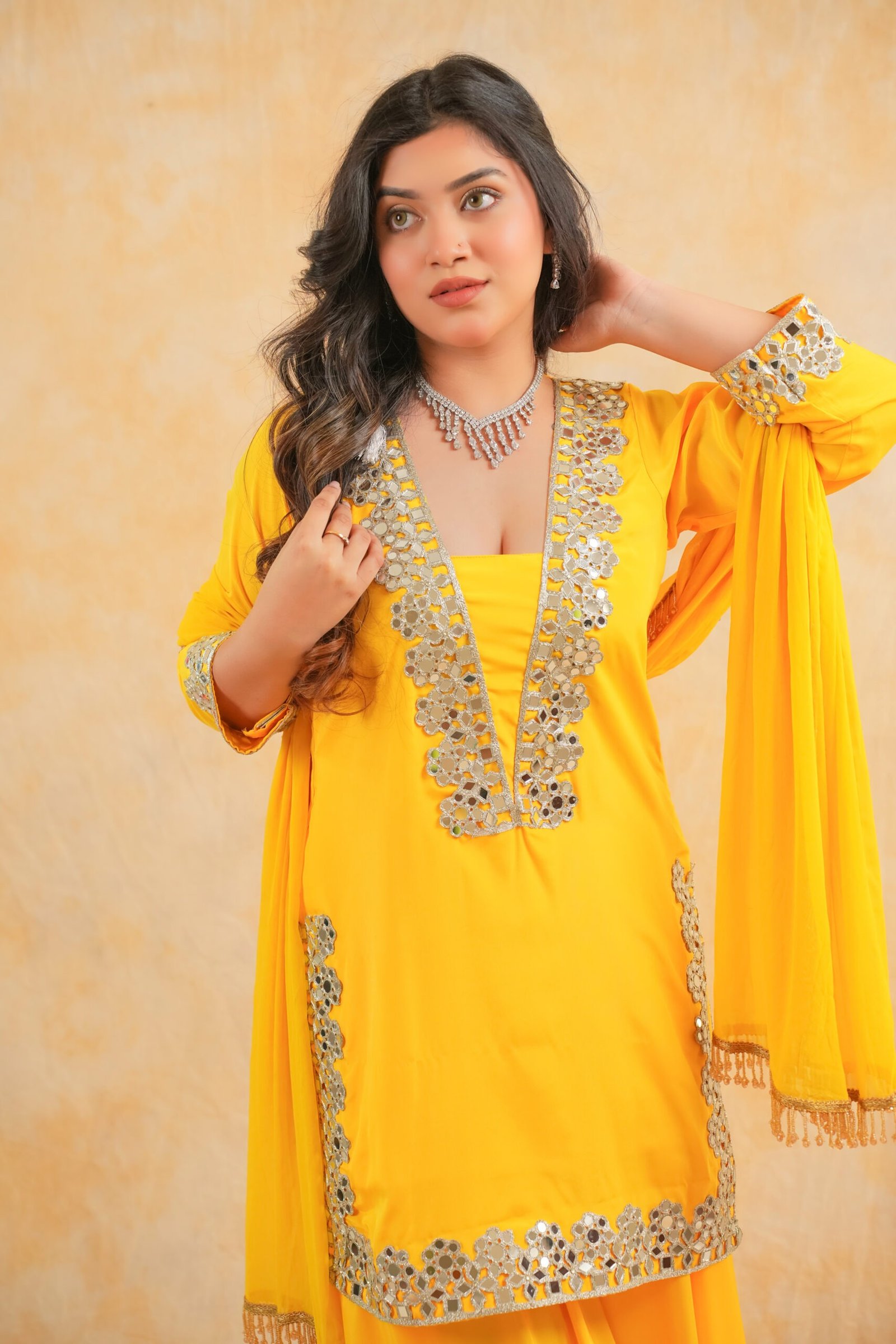 Amber is our mustard – hued contemporary allure kameez sharara ensemble. The shirt is made up of richly embroidered mirror work and floral motifs embellished panels. It is paired with a voluminous Armani silk sharara with delicate mirror. The dupatta to go with it is equally charming made of airy georgette that is solid and has crystals on all four sides.