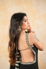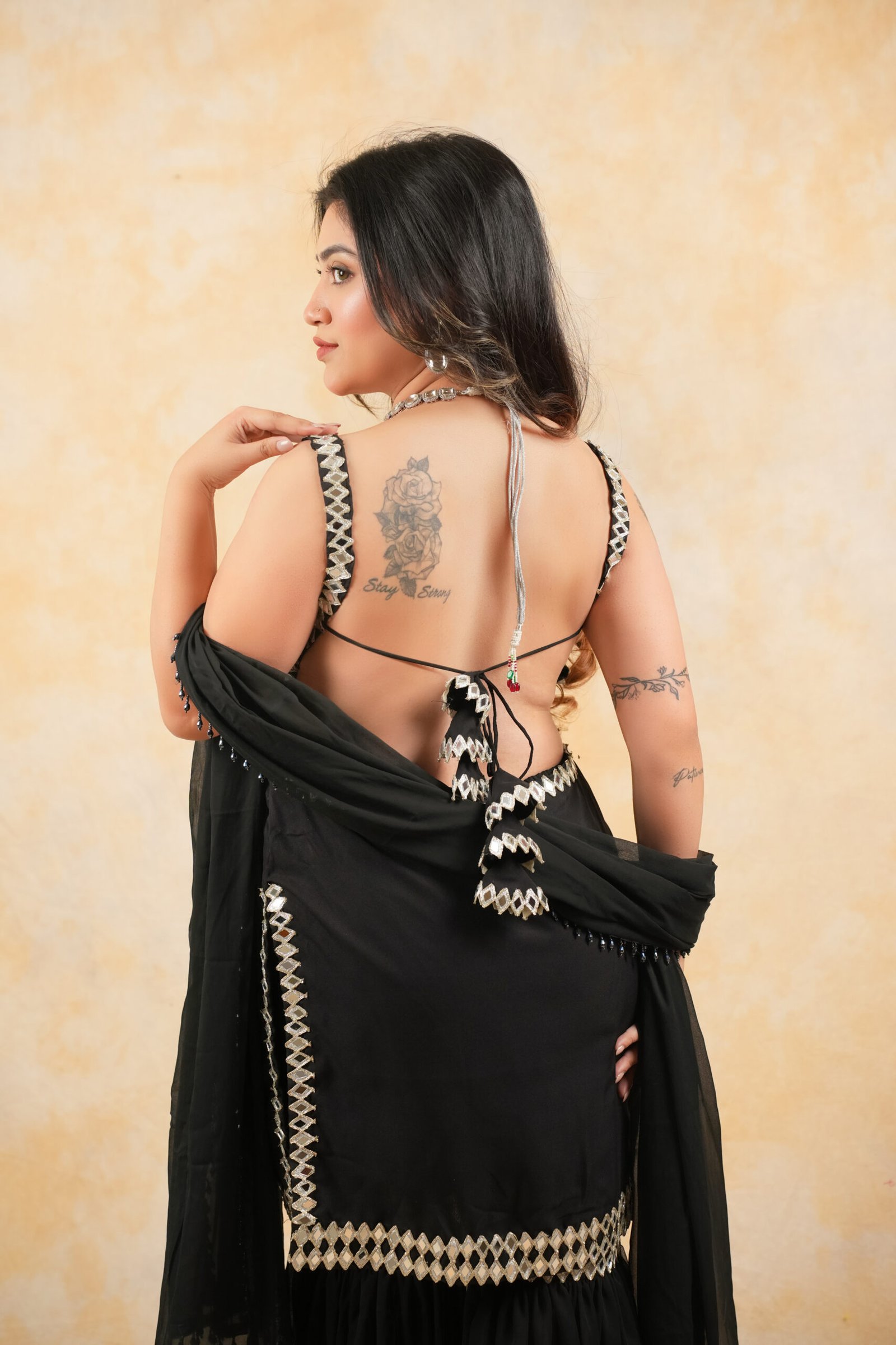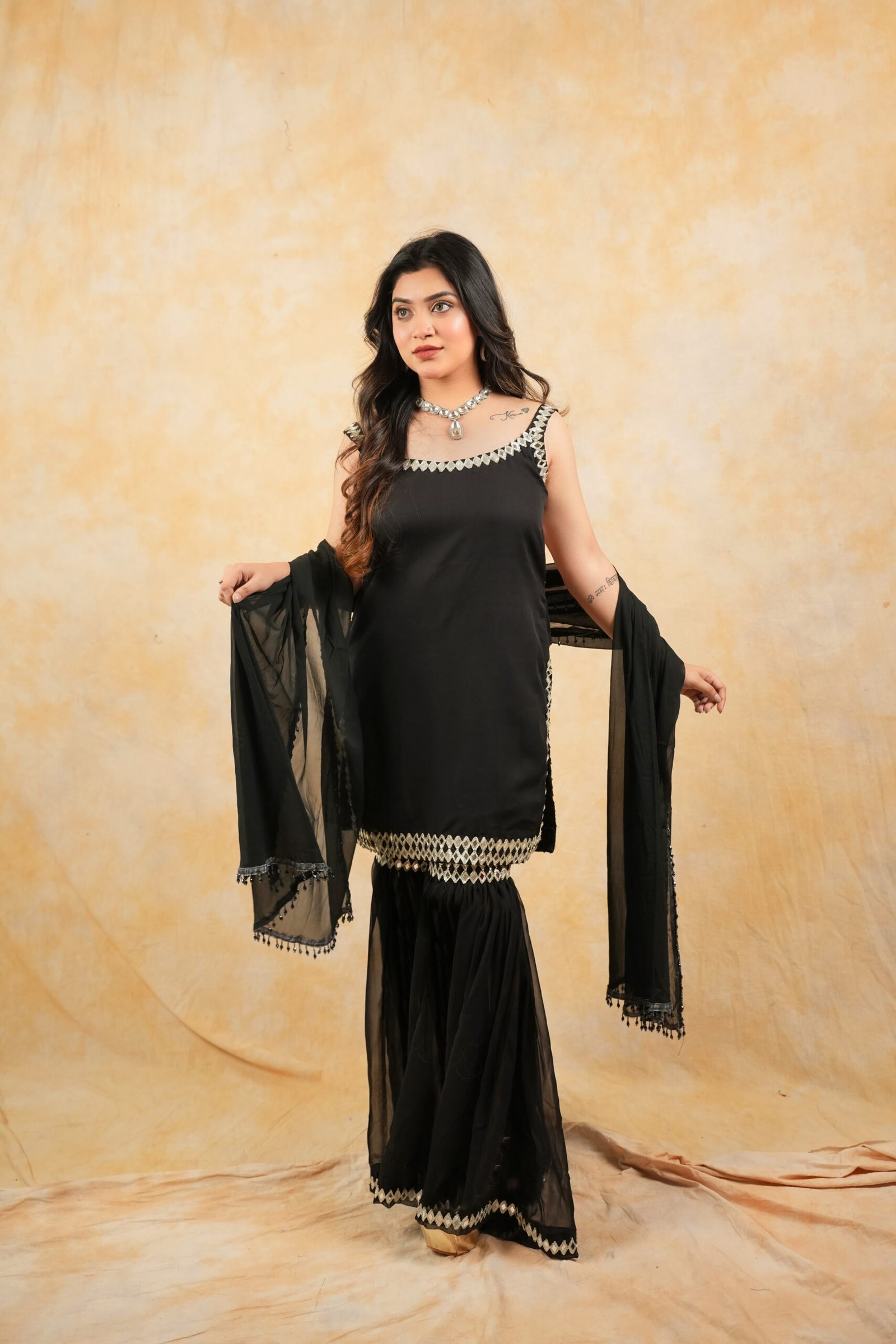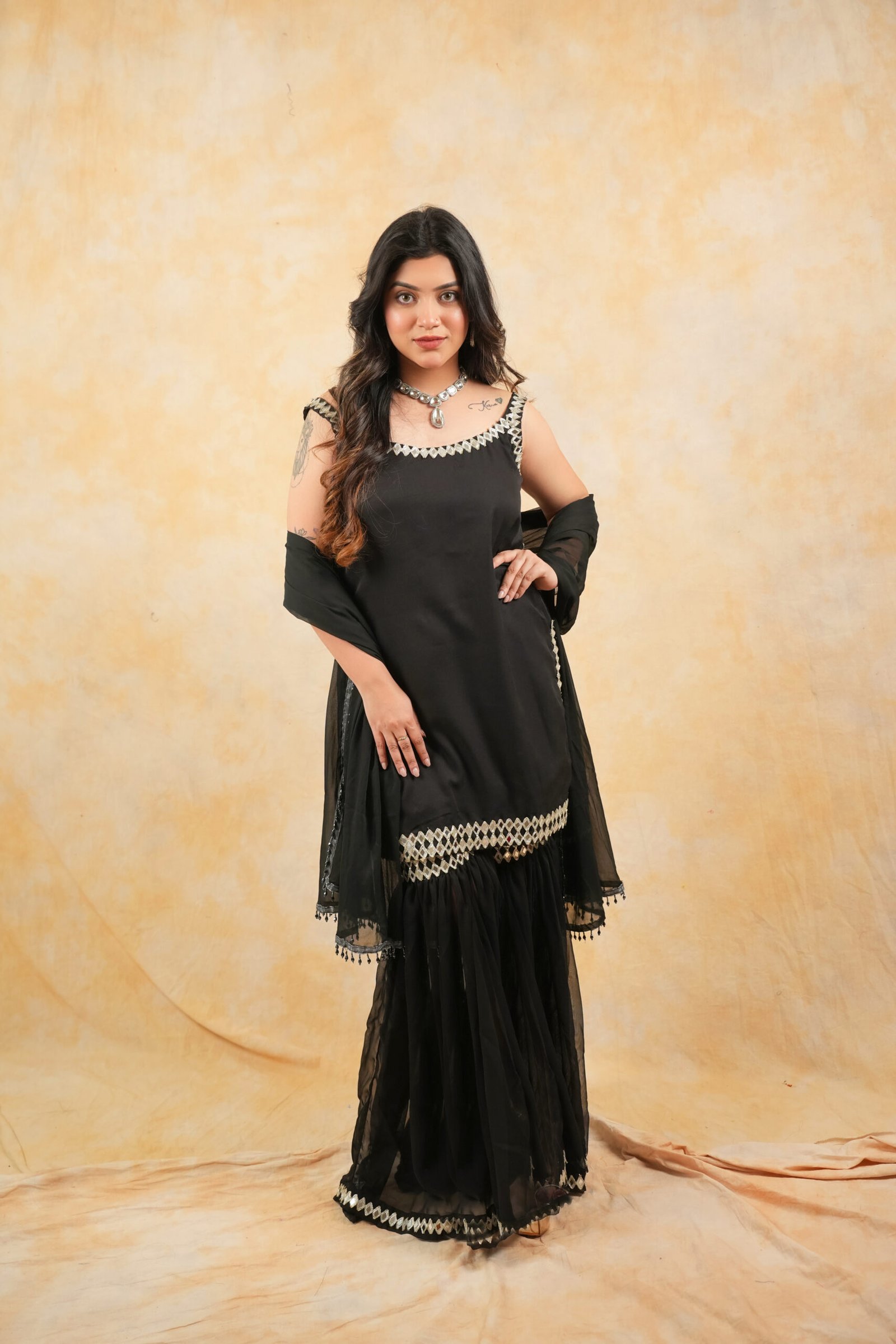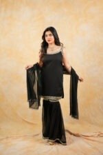 Introducing our exquisite Royal Black Sharara Set. This elegant ensemble features a black shirt intricately adorned with handcrafted silver mirror work, complemented by layers of shimmering sequins in silver tones. Paired with a layered georgette sharara embellished with delicate crystals, and finished with a chiffon dupatta, this ensemble epitomizes sophistication & luxury .
