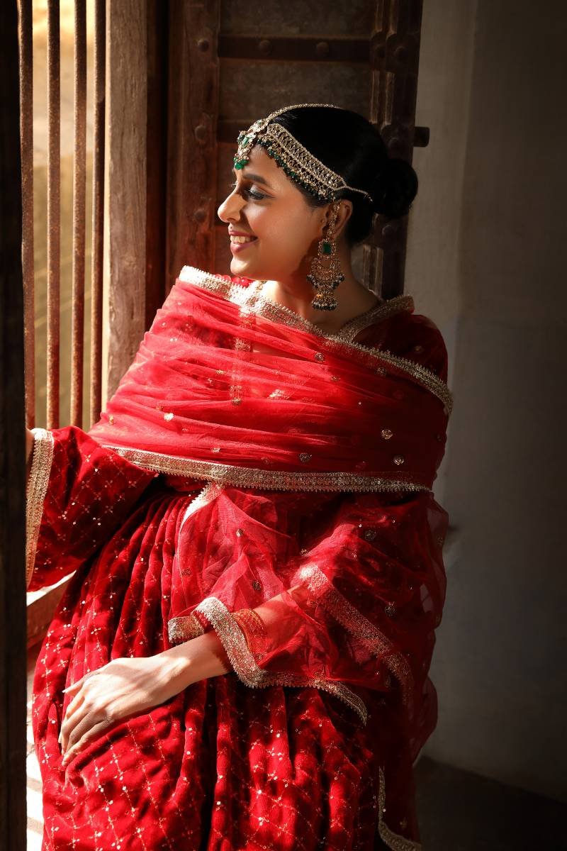 An opulence woven into every thread . Hand embellished bodice meets shimmering gold butta work all over the flare . Mesmerising hues, intricate embroidery, and luxurious velvet weave come together in a captivating collection. Embrace the magic of winter in every thread and pattern.