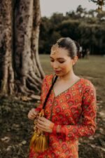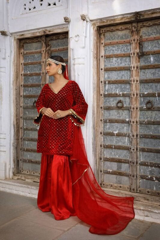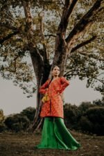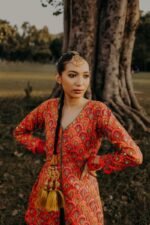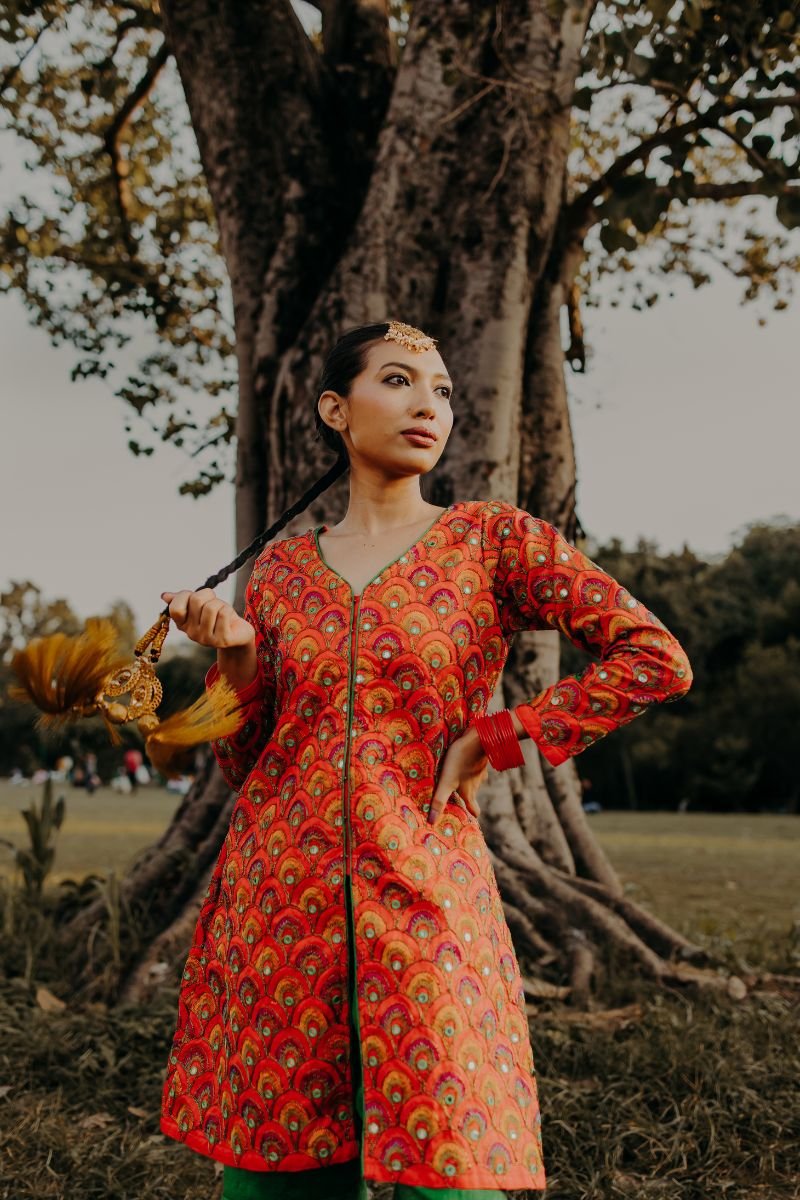 Exquisite Raw Orange-Red Shirt with Multicolor Peacock Feather, Embellishments: Featuring Nakshi, and Mirror Sitara work in the Front. Paired with a Flared Bottom for a Perfectly Polished Ensemble.