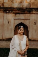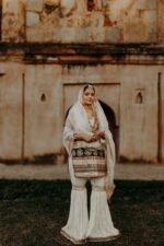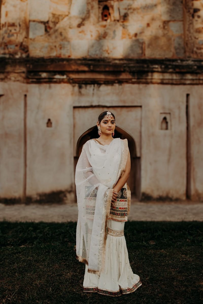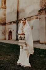 Off – white NAGMA is all decked up with delicate motifs in multicoloured shades embroidery enhanced with gold tilla and sequin topped. lt has been paired with spray crushed sharara and completing this look with net dupatta and heavy intricate gota border.